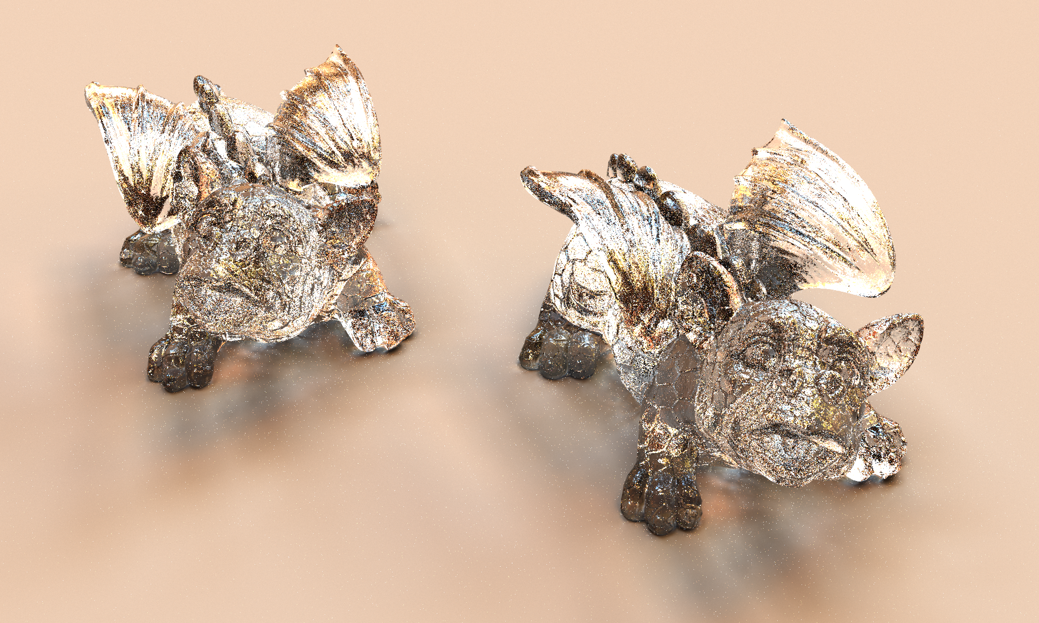 Other than that, the use of OptiX is pretty straightforward: I create the per-object BLASes and instance accel struct as described above; there’s one closest hit program for the triangle mesh that “deconstructs” the merged-mesh information, and stores primitive ID, instance ID, material ID, texture ID, etc, in the per-ray data. All textures, materials, etc, get first “serialized” on the host (ie, all textures, materials, etc, first all get collected into a single linear array each), then uploaded into an OWLBuffer of the respetive OWL_USER_TYPE(DisneyMaterial), OWL_TEXTURE, etc; these buffers then get attached to to the global LaunchParams from which they are accessible to both CH program and raygen program. All path tracing currently happens in the raygen program.
