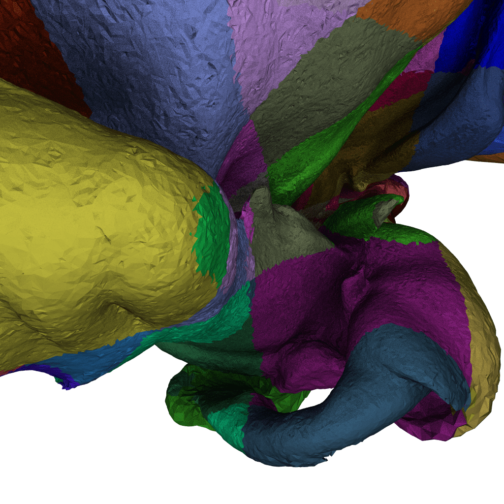 Next let let’s use a color-coded version of this iso-surface, where different colors indicate some spatial pre-partitioning into blocks of already non-trivial models (remember, this is a isosurface from a volumetric mesh). As to how big each color-coded chunk is: I can’t say for sure (that image is over a year old), but I’m fairly certain those are the same as the “submeshes” we talk about in the paper, so roughly 64K vertices (maybe around 250K elements?) per chunk.